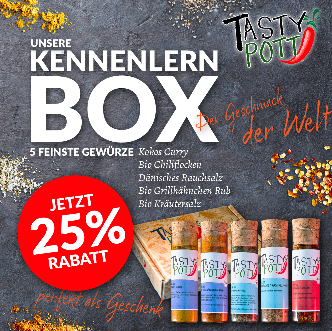 Unsere Philosophie bei Tasty Pott basiert auf der Leidenschaft für Gewürze. Als Team von Gewürzliebhabern aus dem Herzen des Ruhrpotts haben wir es uns zur Aufgabe gemacht, dir köstlichen und explosiven Geschmack nach Hause zu liefern. Wir wählen sorgfältig fein abgestimmte Einzelgewürze oder Mischungen aus und füllen sie in schicke Blechdosen mit praktischem Streueinsatz oder längliche Gläser mit Kork Deckel ab.