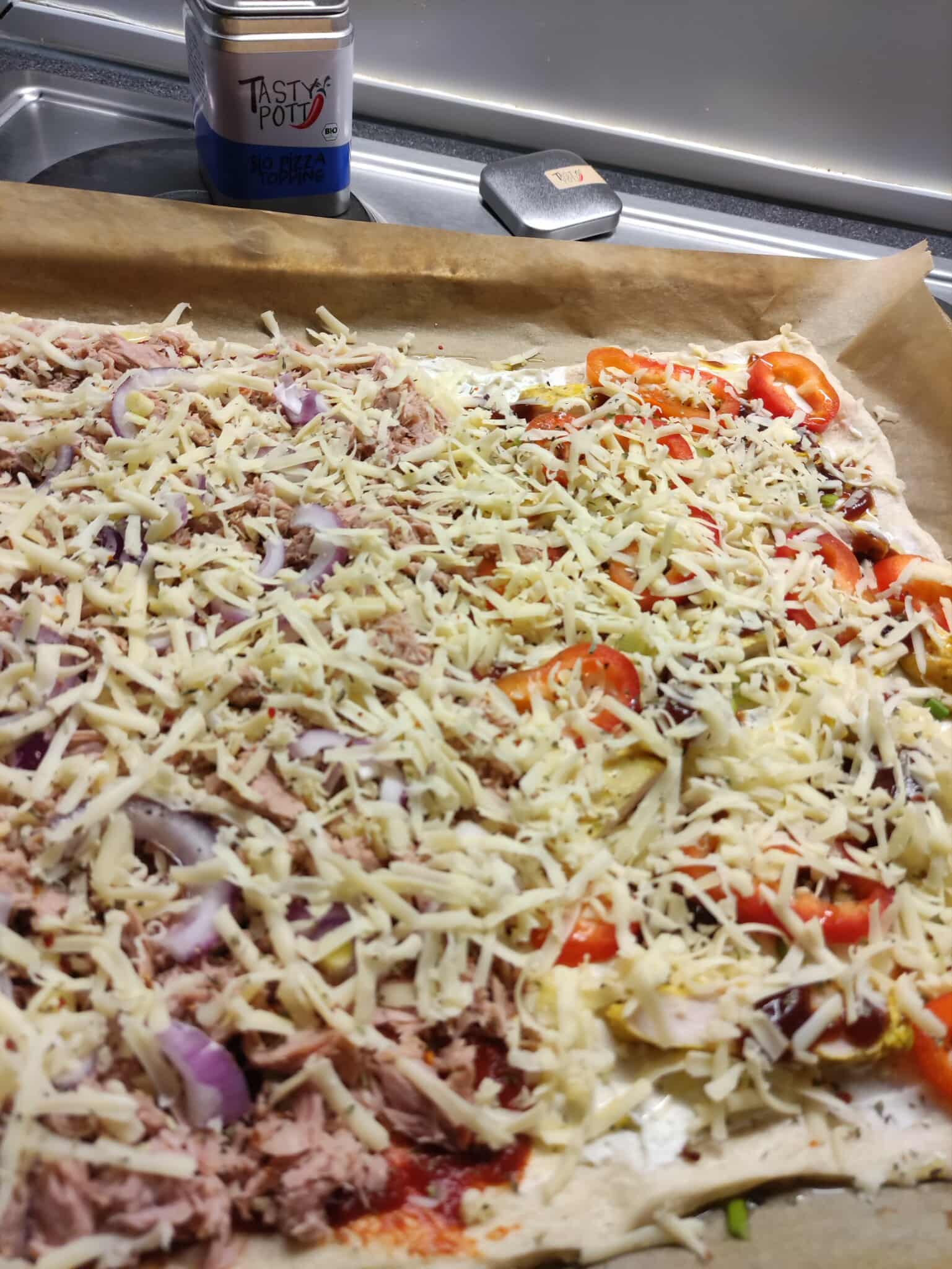 Zum Schluss noch etwas Pizza Topping drüber streuen - fertig